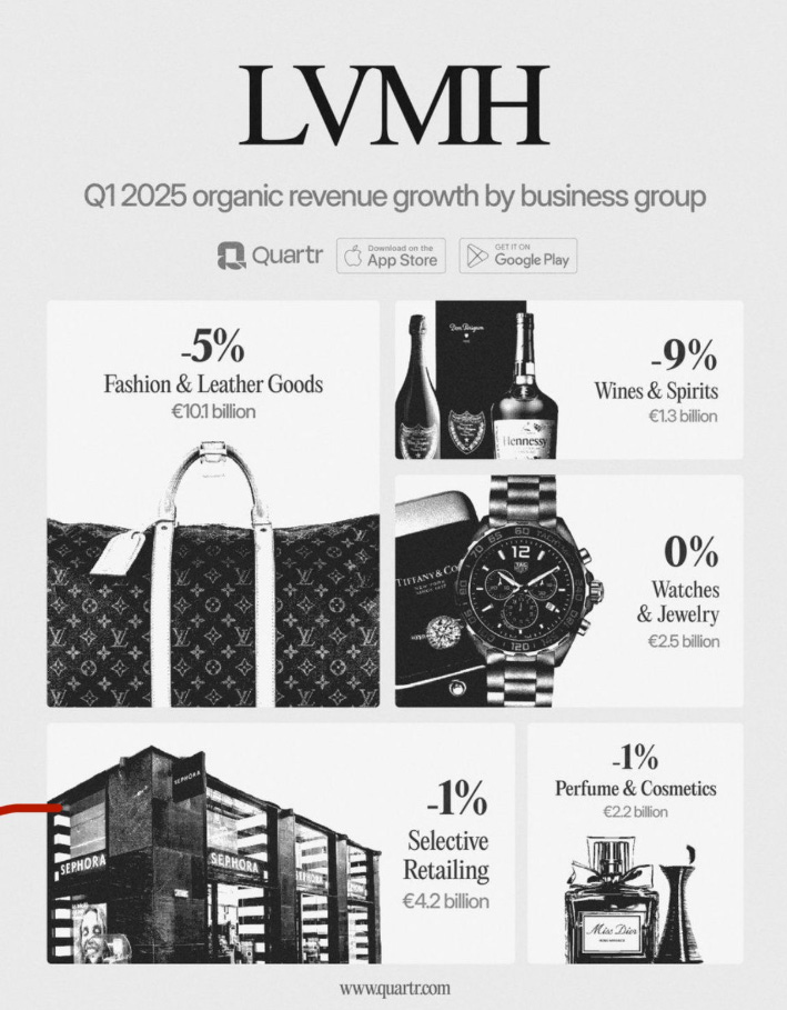 Avec un chiffre d’affaires en baisse de -3 % en organique au T1 2025 (20,3 Mds €), les résultats du groupe de Bernard Arnault ne sont clairement pas au rendez-vous…👇